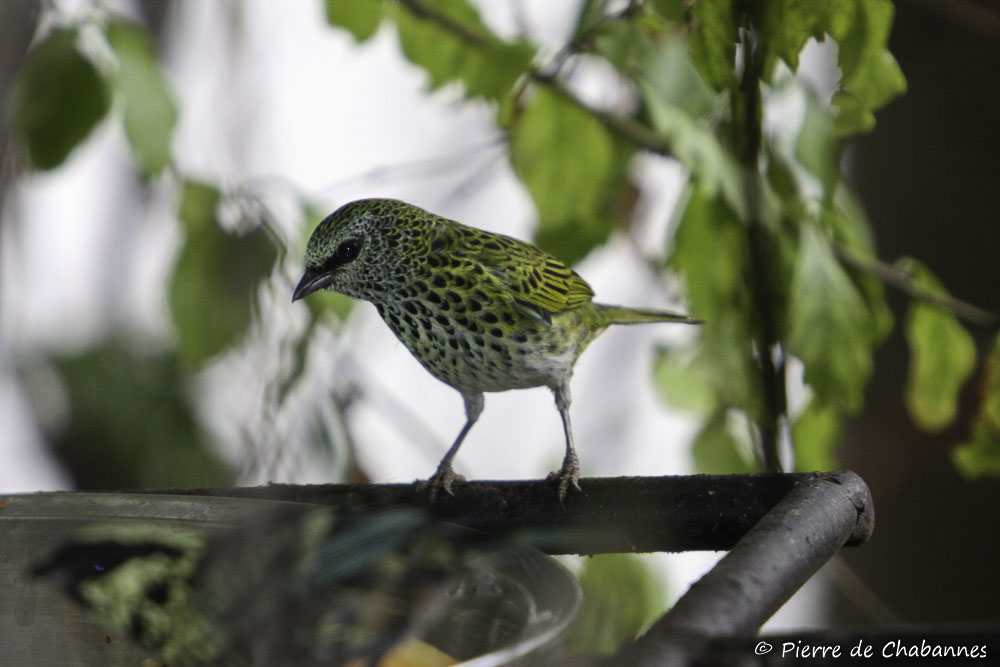 Dark grey bill. Head and breast light whitish-blue with dense black spotting. Rest of plumage green to lemon-green with dense spotting on belly and wings. Flight feathers green and blue.