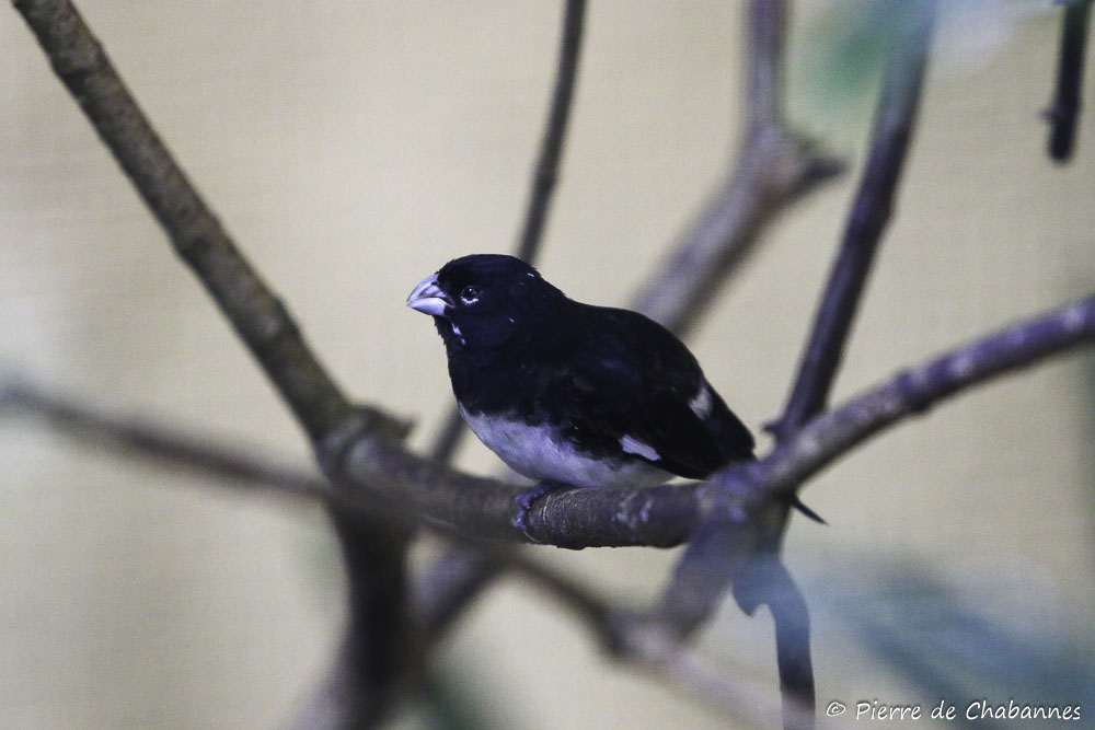 Short but very thick silvery bill. Female brown with brown bill. Male black with dark blue tinge to flanks and sides of head. White line under eye and wing patch. White lower breast and belly.