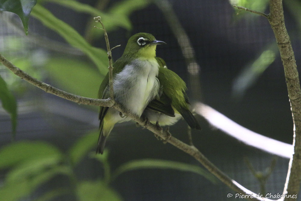 Silvery bill with black tip, black line from bill to eye, broad white eyering, broken at front. Plumage olive-green on head, wings, back and tail, underside light grey, throat and belly light yellow.