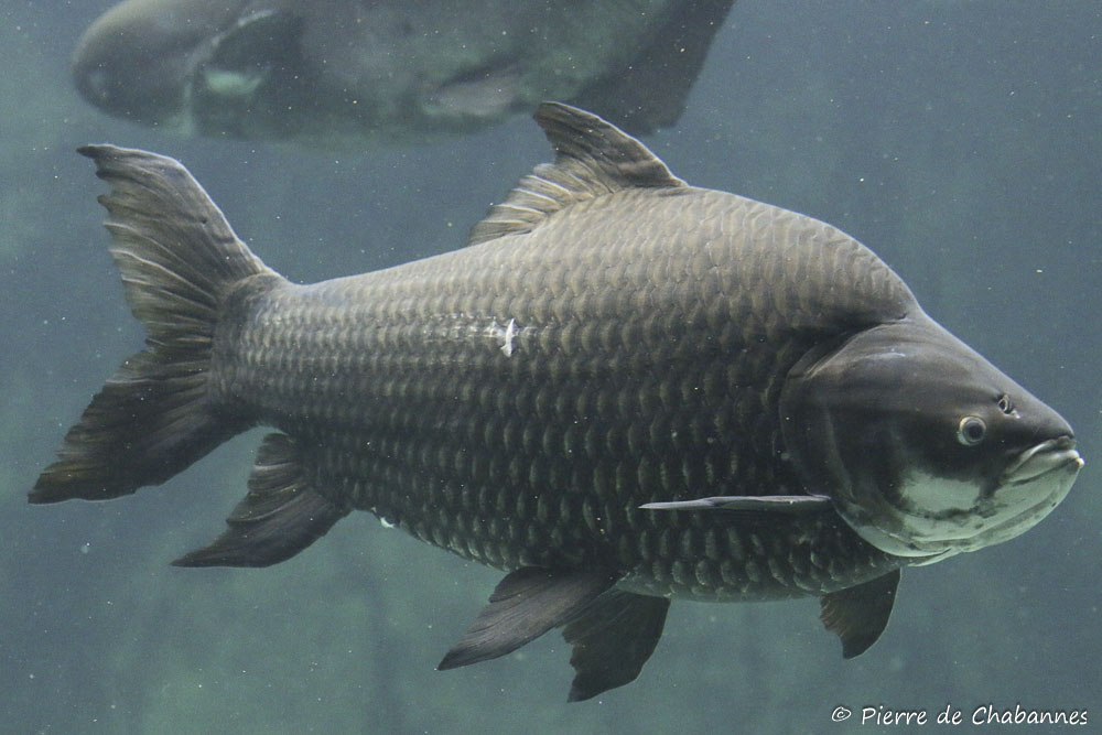 One of the world’s largest carps, growing to over 3 meters in length for a maximum weight above 3 kg. Very large head with thick lips and white lower lip. Body with humped back and large white-banded black scales. Very dark fins.