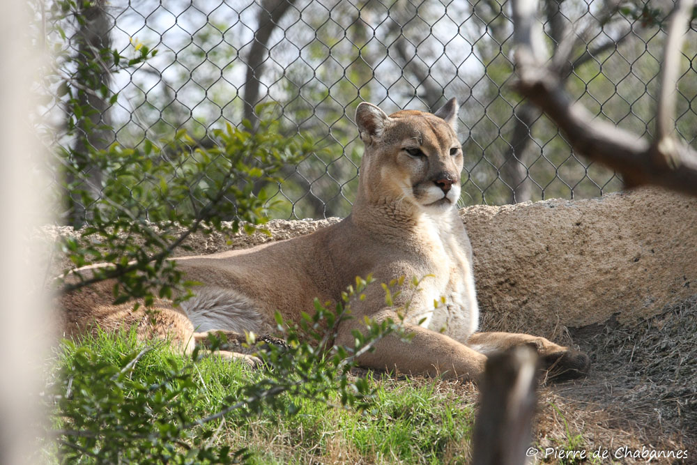 Body length of 155 cm, tail length of 97 cm, weight of 72 kg. Unmistakable. Large but slender body, fairly small head. Long bushy tail. North American subspecies are grey-beige to light brown with white belly, breast and snout.