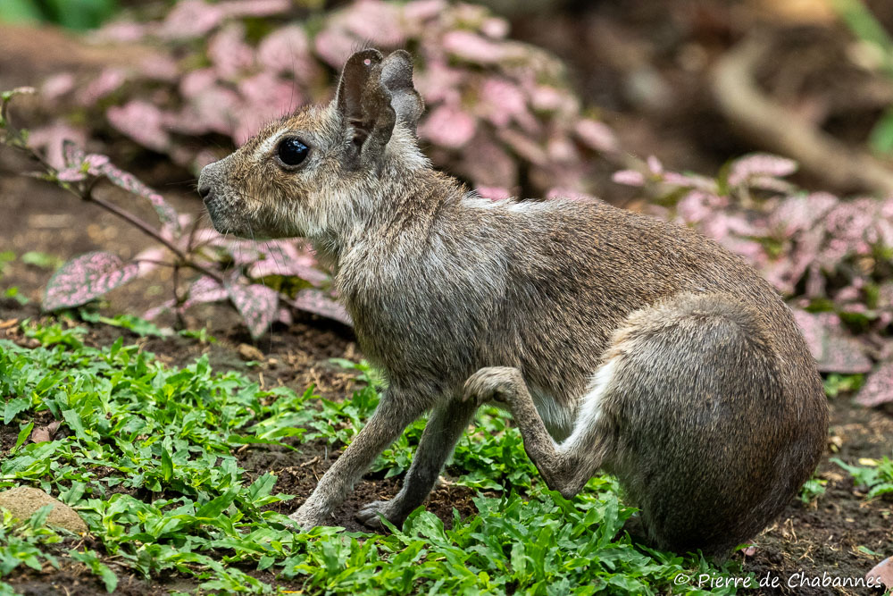 Adults can reach a body length of 48 cm for a weight of 2.3 kg. Similar to Patagonian mara but much smaller and with conspicuous white area around eyes. Coloration grey to beige-grey with brownish rump, orange cheeks and white belly.