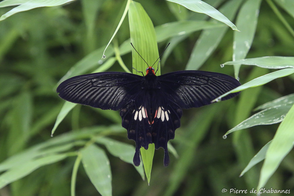 Adults can reach a wingspan of 10 cm. Mostly black, broad and long forewings. Hindwings have club-like extensions, a row of bright red spots on edges for females and a group of white spots in the middle. Body has red markings. Male duller